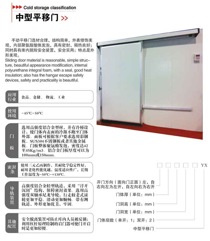 平移門選材合理,結構簡單,外表修飾美觀,內(nèi)部聚氨酯整體發(fā)泡,具有密封、隔熱良好;同時具有庫內(nèi)脫險安全裝置,安全實用;特點是外形美觀。