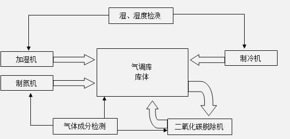 氣調冷庫又稱氣調儲藏庫,是當今最先進的果蔬保鮮儲藏冷庫。它是在冷藏保鮮的基礎上,增加氣體成分調節,通過對儲藏環境中溫度、濕度、二氧化碳、氧氣濃度和乙烯濃度等條件的控制,抑制果蔬呼吸作用,延緩其新陳代謝過程,更好地保持果蔬新鮮度和商品性,延長果蔬儲藏期和銷售貨架期。通常氣調儲藏比普通冷藏可延長儲藏期2~3倍。一座完整的氣調庫主要由庫體結構、氣調系統和制冷加濕系統三大部分組成,如圖所示。